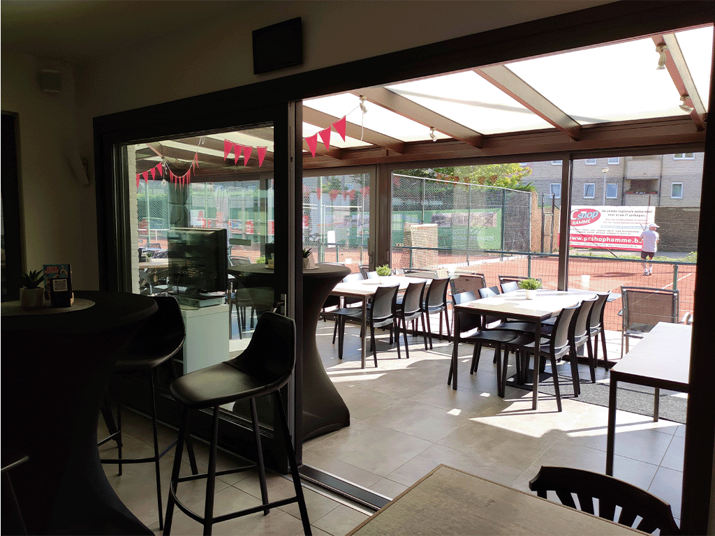 Bij goed weer kan je genieten van ons groot terras met zicht op onze tennisterreinen.
