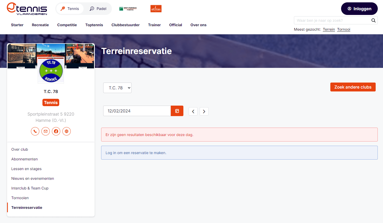 Reserveren met losse verhuur: je kan pas een terrein reserveren als je aangesloten bent bij Tennis Vlaanderen.